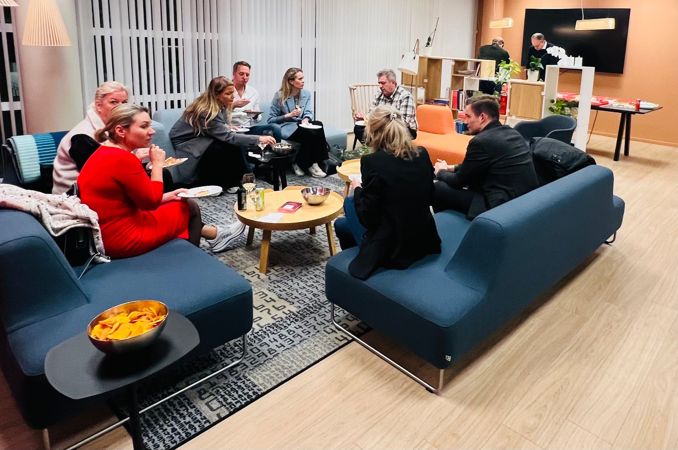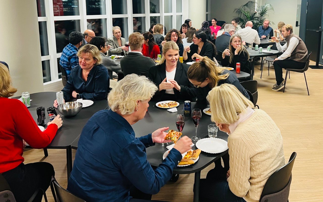 Med det budskapet lot forsamlingen seg villig friste av pizzabuffet, mineralvann og alkoholfrie drikker. Og mingling med prat som «hei, hvordan går det deg?» og «hørte du hadde byttet jobb, funker det, eller?» ga energipåfyll etter en lang dag som gikk mot kveld.