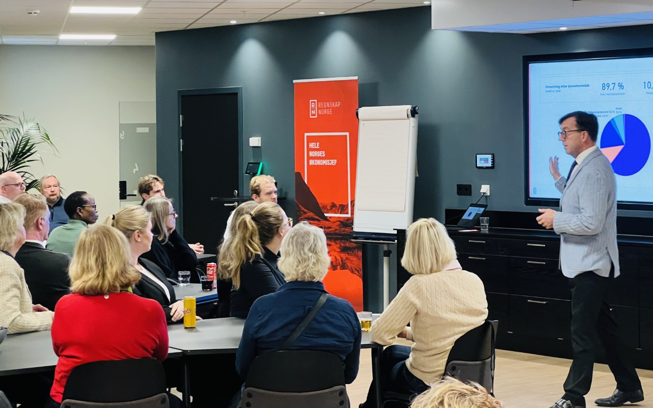 50 hadde meldt seg på for å høre Regnskap Norge-sjef Rune Aale-Hansen snakke kort og konsist om tingenes tilstand i bransjen vår. Og der er det mye som skjer, med høy omsetning totalt sett – og med stadig flere oppkjøp.