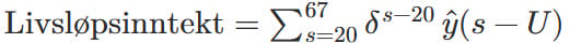 Der δ er (1+r)^-1 som tilsvarer diskonteringsfaktoren per år, der r er den reelle diskonteringsrenten. Summeringen skjer over alle år, fra 20 til 67 år.