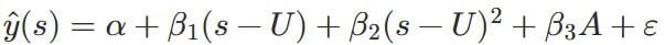 Hvor y er forventet lønnsinntekt ved alder s, og (s – U) representerer antall års erfaring gitt alder ved fullført utdanning U. Autorisasjon uttrykkes ved A og er en binær variabel om tar verdien 1 hvis statsautorisasjon, og ellers 0.