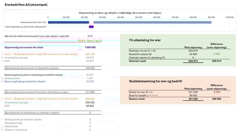Den nederste delen av arket viser automatisk optimal disponering av årsresultatet basert på AGA-sone, årsresultat og opptjent skjerming, samt den skattemessige gevinsten av skjermingsfradraget.