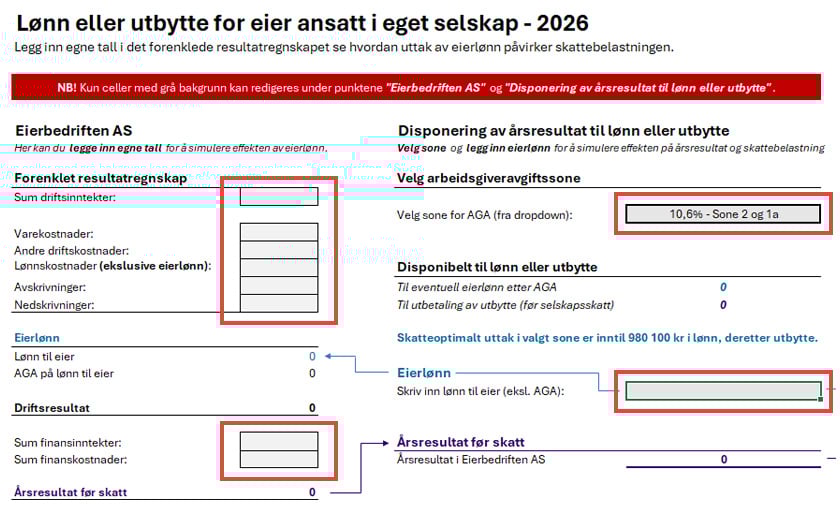 Oppsettet bygger på et forenklet resultatregnskap for «Eierbedriften AS», som fungerer som et budsjett for 2026. Her kan du legge inn egne tall for å illustrere effekten for den enkelte eierbedrift. Hensikten er å synliggjøre disponibelt beløp før det tas ut lønn eller utbytte.