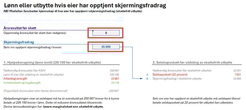 Dette arket bygger på tallene fra «Lønn eller utbytte» og henter automatisk årsresultat før skatt og valgt arbeidsgiveravgiftssone. Utgangspunktet er at det ennå ikke er tatt ut verken eierlønn eller utbytte, men at eier har tilgang på skattefritt utbytte gjennom skjermingsreglene.