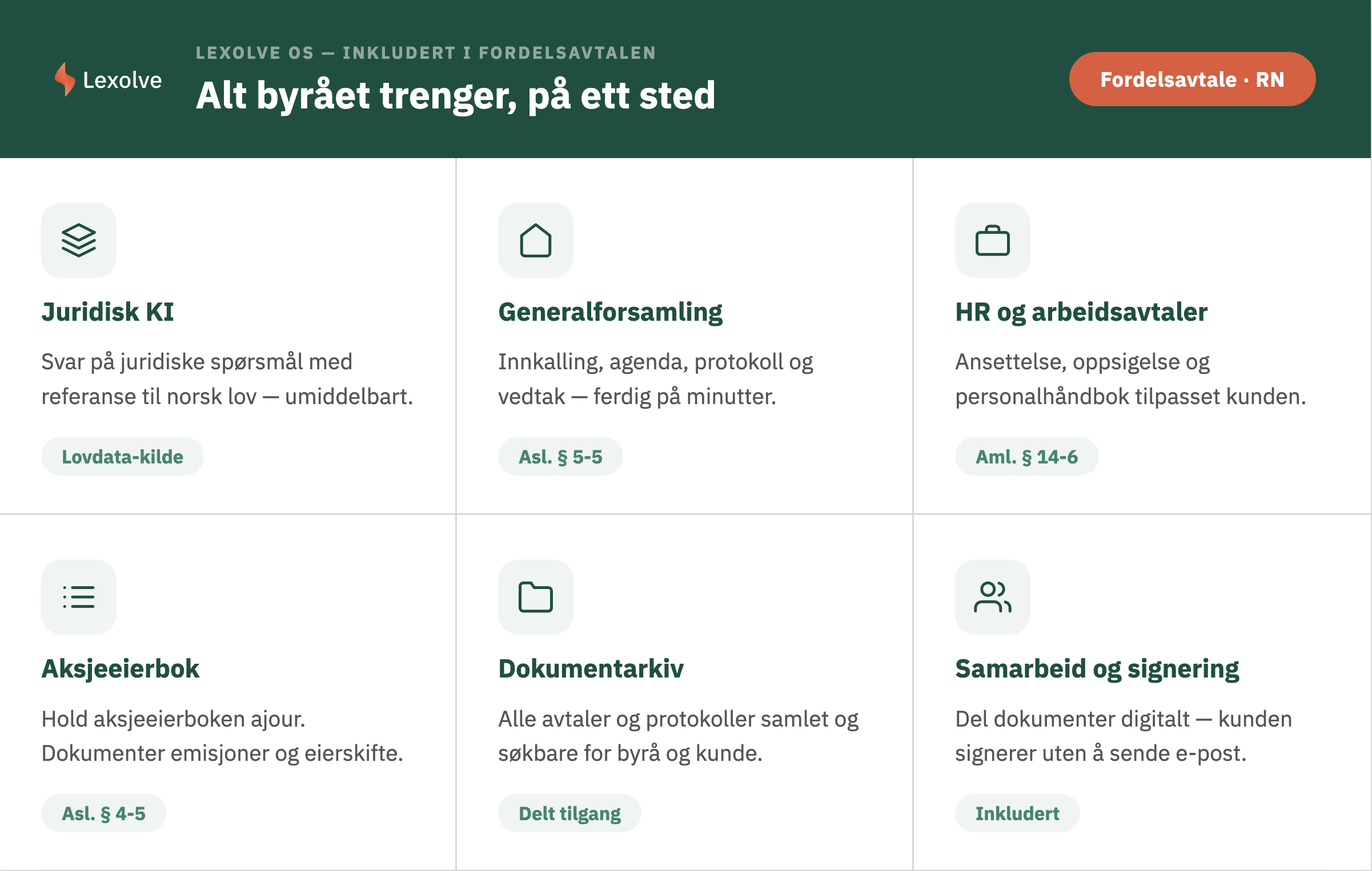 Generalforsamlingsprotokoller, styreinnkallinger og arbeidsavtaler genereres direkte i Lexolve. Nye, fakturerbare tjenester uten ekstra ressurser.